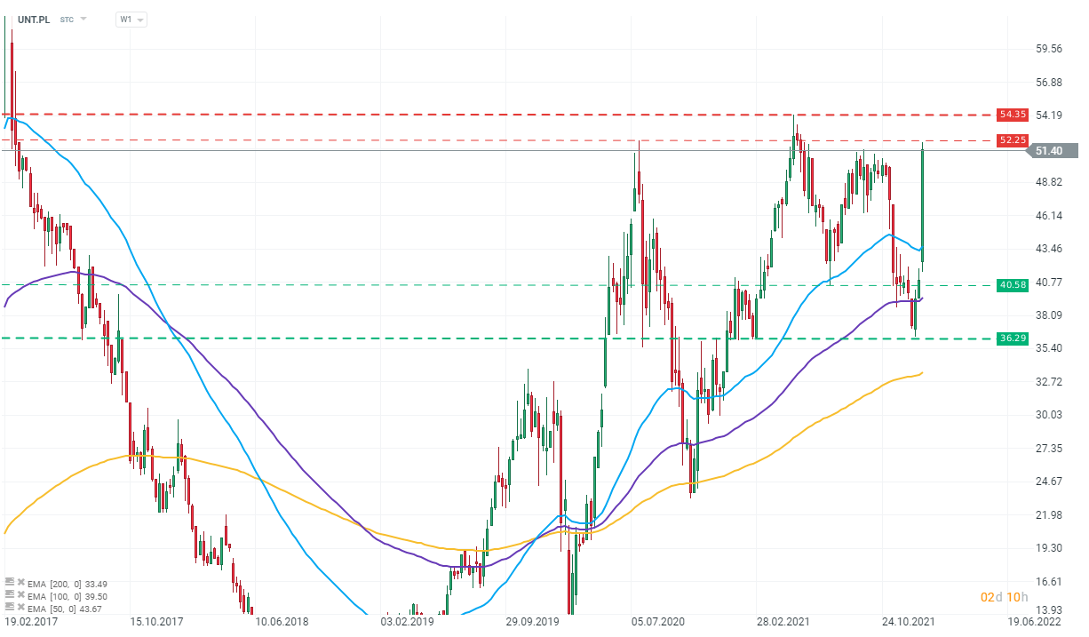 Wykres spółki Unimot (UNT.PL), interwał W1. Walory firmy testują obecnie poziom lokalnego szczytu z 19 lipca 2020 roku i jeśli strona kupujących zdoła utrzymać obecne momentum wzrostowe, poziom 54,35 zł za akcję będzie kolejną barierą do pokonania. Warto jednak pamiętać, że tak dynamiczne wzrosty i skok wartości obrotu mogą powodować duże wahania kursu akcji, które mogą wywoływać głębsze korekty. Źródło: xStation 5