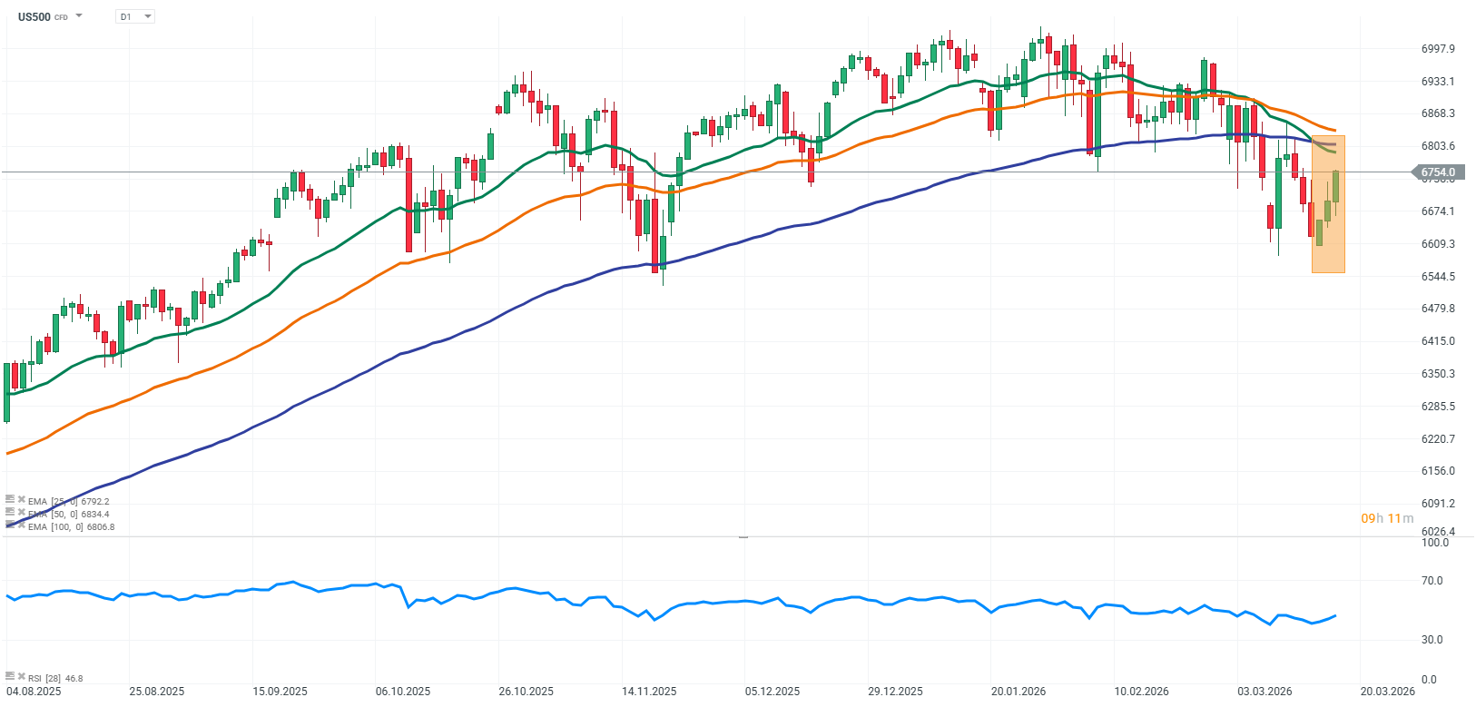 Dzisiaj kontrakty na US500 (S&P 500) notują wyraźne wzrosty, napędzane optymizmem inwestorów. Rynek zakłada, że najtrudniejszy okres jest już za nim i liczy na brak dalszej eskalacji konfliktu na Bliskim Wschodzie. Pozytywne nastroje są wspierane przez “przecieki” dotyczące postępów w negocjacjach między USA, a Iranem.