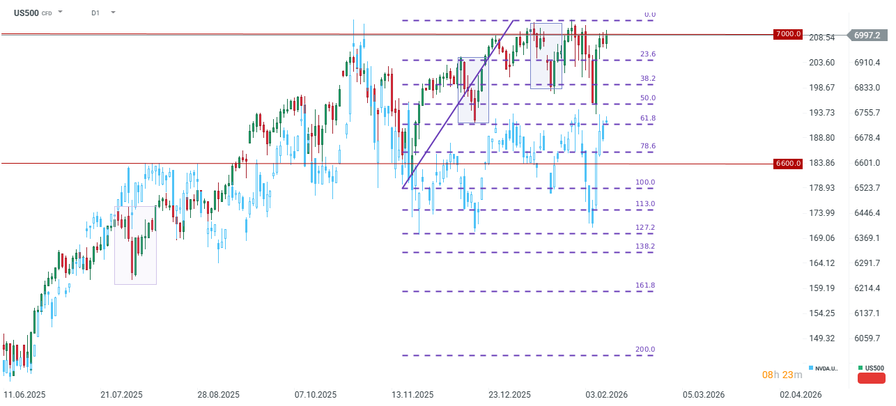 Dzisiaj obserwujemy kontynuację wzrostów, po chwilowym wczorajszym przystanku. Dzisiaj wzrosty motywowane są przede wszystkim dobrymi nastrojami dotyczącymi spółek technologicznych. US500 testuje okolice 7000 punktów, nawet pomimo zmniejszonych szans na obniżki, ale przy lepszym obrazie amerykańskiej gospodarki.