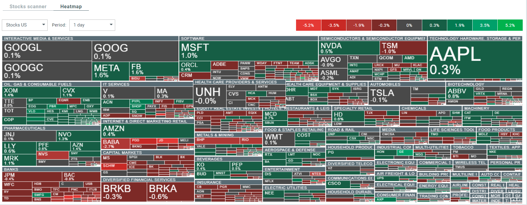 Akcje indeksu S&P 500 skategoryzowane według sektorów i branż. Wielkość pokazuje kapitalizację rynkową. Źródło: xStation5