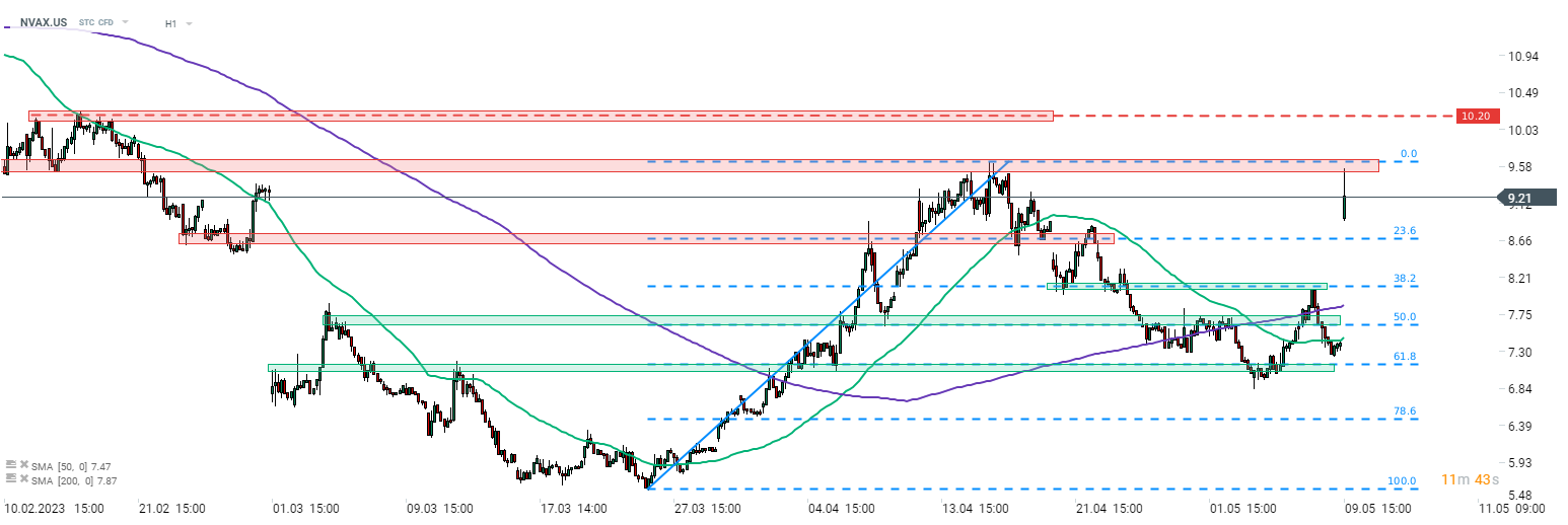 Novovax (NVAX.US) rozpoczął dzisiejsze notowania wyżej po informacji o zwolnieniach. Akcje wzrosły o ponad 30% na początku dzisiejszej sesji i przetestowały ostatnie lokalne maksima w rejonie 9,50 USD. Źródło: xStation5
