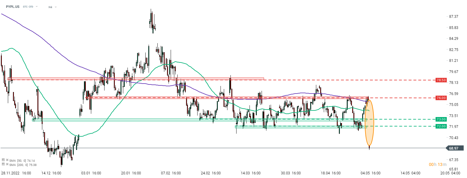 Akcje PayPal (PYPL.US) tracą pomimo przedstawienia lepszych od oczekiwań wyników za I kw. 2023 r. Akcje rozpoczęły dzisiejszy handel z dużą niedźwiedzią luką cenową i są notowane poniżej dolnego ograniczenia niedawnego krótkoterminowego zakresu. Jeśli kupującym nie uda się odzyskać kontroli nad rynkiem, akcje mogą się dalej osuwać i spoglądać w kierunku minimów z połowy i końca 2022 roku w rejonie 67 USD. Źródło: xStation5