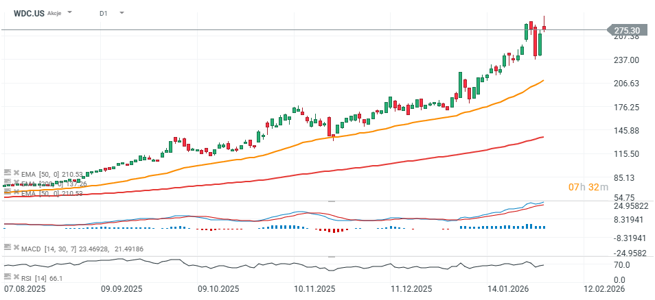 Western Digital (WD) w skrócie: spółka pokazała 3,0 mld USD przychodów, czyli +25% r/r, wyraźnie powyżej oczekiwań rynku, co wzmacnia narrację, że WD przestaje być „tylko” producentem klasycznych dysków. Zarząd mocno akcentuje kierunek infrastruktury AI dla centrów danych, wskazując na rosnący popyt ze strony hyperscalerów na wysokopojemnościowe HDD. Wyniki zyskowności też były solidne: Non-GAAP EPS 2,13 USD, a GAAP EPS 4,73 USD.