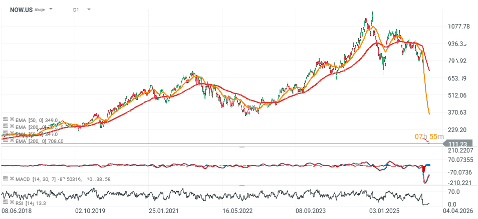 - Akcje ServiceNow (NOW.US) spadają 6% i osiągają najniższy poziom od wiosny 2024 roku mimo dość mocnych wyników finansowych i blisko 20% wzrosty przychodów r/r