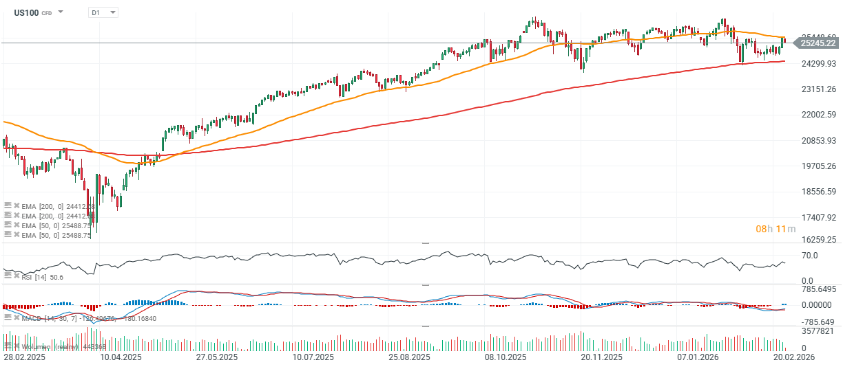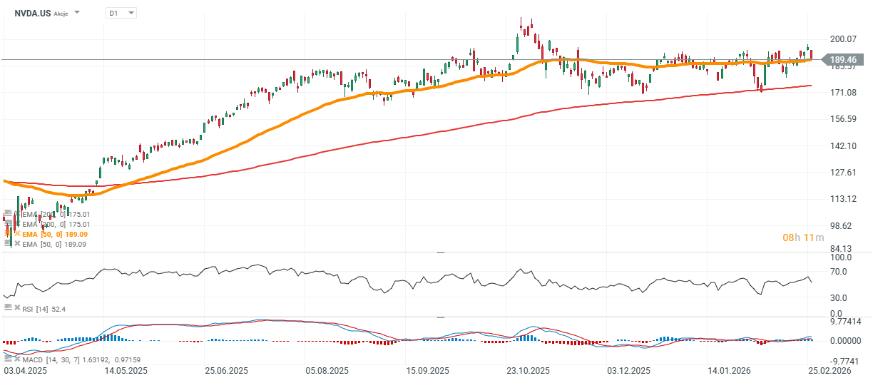 Liczba nowych wniosków wyniosła, po uwzględnieniu czynników sezonowych, 212 tys. w tygodniu zakończonym 21 lutego. To wzrost o 4 tys. względem skorygowanego w górę odczytu z poprzedniego tygodnia, ale poniżej konsensusu Dow Jones na poziomie 215 tys. W ujęciu średniej czterotygodniowej wskaźnik wzrósł jedynie o 750 do 220 250. Liczba kontynuowanych wniosków (publikowanych z tygodniowym opóźnieniem) spadła o 31 tys. do 1,833 miliona wniosków. Dane sugerują prawdopodobną, dłuższą pauzę w luzowaniu polityki Fed. Ponad 3% spadek cen akcji Nvidia ciąży nastrojom rynków, a prawie 13% notuje duża spółka sektora lotniczo-obronnego, Heico (HEI.US).