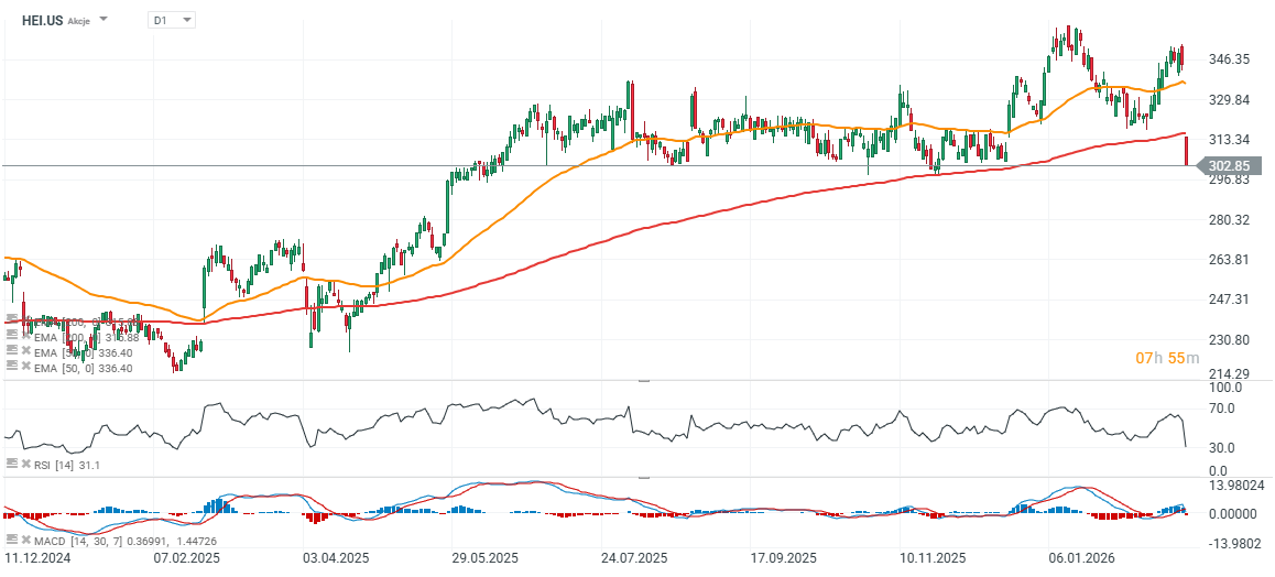 Akcje spółki z branży lotniczo-obronnej, Heico (HEI.US) zareagowały spadkiem o ponad 12% po raporcie, mimo że spółka pokazała rekordowy zysk w pierwszym kwartale i utrzymała dwucyfrowe tempo wzrostu sprzedaży. To klasyczny przykład sytuacji, w której rynek „kupuje plotki, sprzedaje fakty”: inwestorzy mogli oczekiwać jeszcze lepszego profilu marż, a część uwagi przesunęła się na mieszankę produktową w segmencie Electronic Technologies oraz na wzrost dźwigni finansowej po ostatnim przejęciu.
