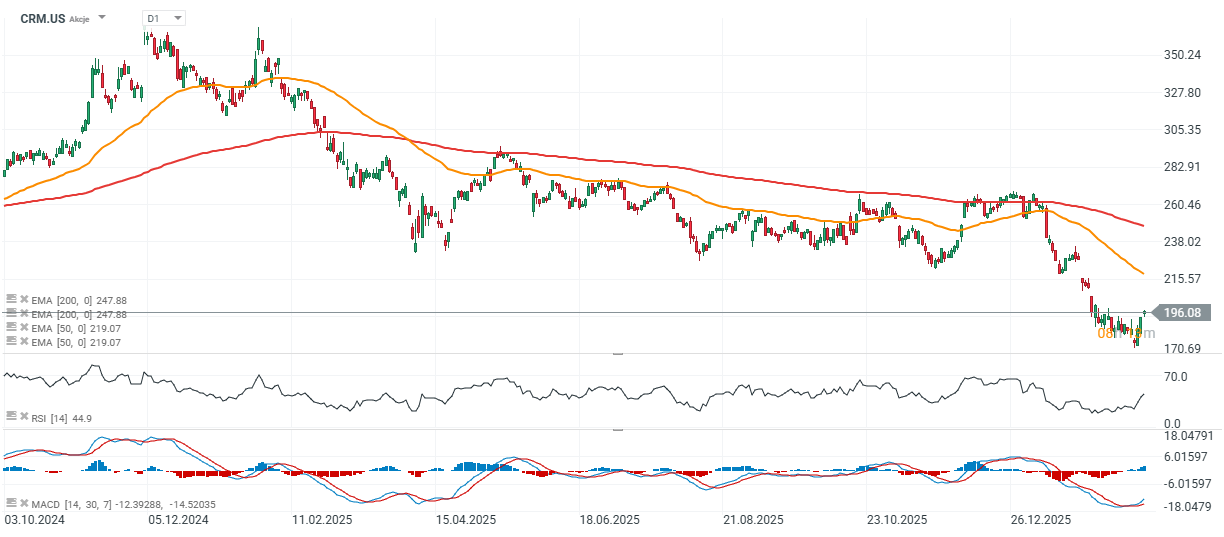 Salesforce (CRM) zyskuje 2% po przedstawieniu umiarkowanej prognozy wzrostu sprzedaży w nowym roku fiskalnym, co złagodziło obawy inwestorów, że spółka może tracić udziały na rzecz nowych konkurentów w erze AI.