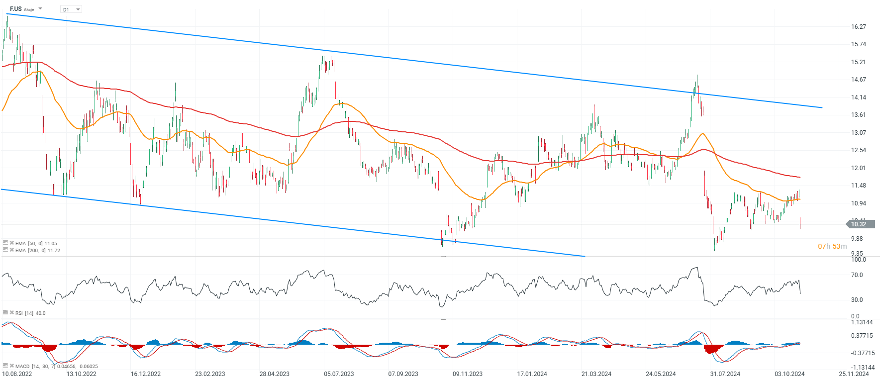 Akcje Forda osunęły się poniżej 50 i 200-sesyjnych średnich kroczących sugerując powrót do trendu spadkowego i zarazem retest dolnego ograniczenia kanału cenowego.
