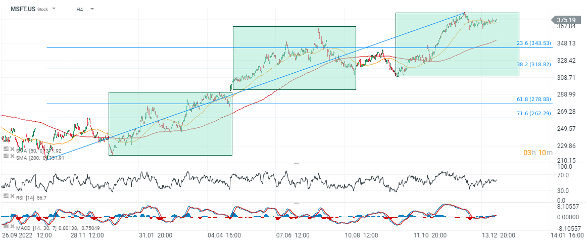 Patrząc na akcje Microsoftu, widzimy, że jeśli dotychczasowa struktura wzrostowa miałaby zostać zachowana, istnieje potencjał do korekty spadkowej w kierunku 340 USD za walor, gdzie widzimy 23,6 zniesienie Fibonacciego fali wzrostowej z 2022 roku. Wskaźnik RSI jest nieco powyżej neutralnych poziomów, dając sporo miejsca na ewentualny spadek lub wzrost cen. Źródło: xStation5
