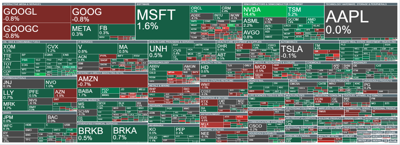 Indeks S&P 500 skategoryzowany według sektorów i branż. Wielkość odzwierciedla kapitalizację rynkową. Źródło: xStation5