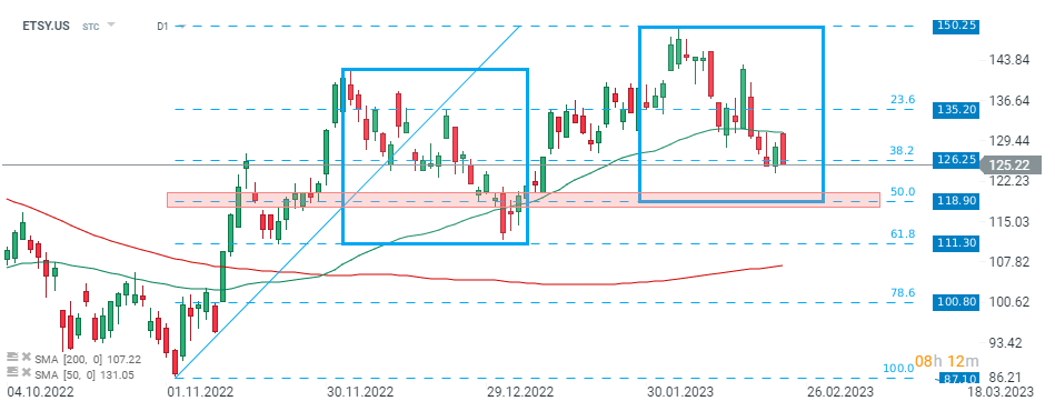 Akcje Etsy (ETSY.US) rozpoczęły sesję z byczą luką cenową jednak kupującym nie utrzymali momentym i cena cofnęła się do lokalnego wsparcia przy 126,25 USD. W przypadku przełamania niższego poziomu, ruch spadkowy może pogłębić się w kierunku kluczowego wsparcia przy $118.90, które wyznacza dolne ograniczenie struktury 1:1 oraz 50$ zniesienia Fibonacciego ostatniej fali wzrostowej. Źródło: xStation5
