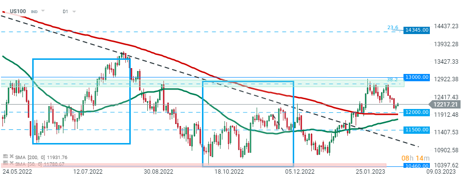 Wczorajszy protokół FOMC został odebrany jastrzębio, niemniej jednak US100 zdołał utrzymać się powyżej kluczowego wsparcia na poziomie 12000 pkt, które zbiega się z 200 SMA (czerwona linia). Dopóki cena będzie utrzymywać się powyżej tego poziomu, może zostać uruchomiony kolejny impuls wzrostowy w kierunku kluczowej strefy oporu w okolicach 13000 pkt, która pokrywa się z 38,2 zniesieniem Fibonacciego fali wzrostowej zapoczątkowanej w marcu 2020 roku. Z drugiej strony, jeśli sprzedającym uda się odzyskać kontrolę, może zostać uruchomiona kolejna fala spadkowa w kierunku wsparcia 11500 pkt. Źródło: xStation5