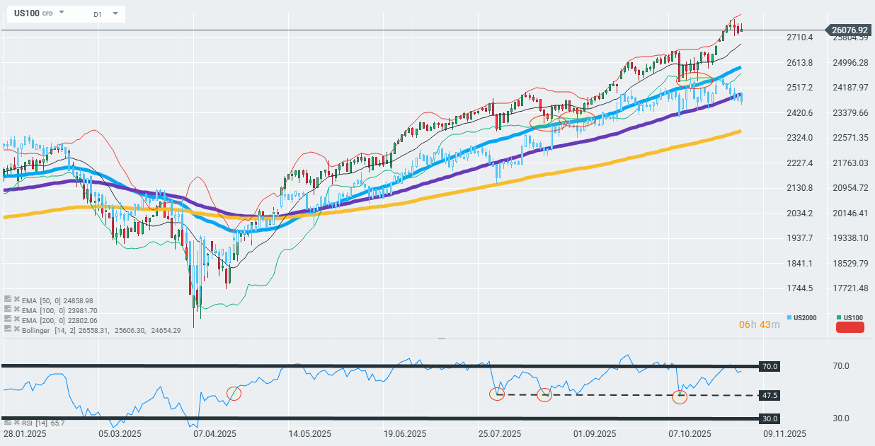 Równocześnie indeksy szerokiego rynku i spółki przemysłowe pozostają w tyle. Dzisiaj więcej niż 400 firm z S&P 500 notuje spadki, a indeks Dow Jones traci już blisko 0,8% na wartości. To pogłębia trend rozwarstwienia, w którym wyniki i wyceny całego rynku coraz bardziej zależą od kilku gigantów technologicznych. Słabe wyniki tradycyjnych spółek, duża wrażliwość mniejszych przedsiębiorstw na koszty kapitału oraz neutralne nastroje wśród konsumentów pokazują, że ewentualna korekta na grupie spółek AI może odczuwalnie uderzyć w całość rynku. Wyniki, które poznamy w tym tygodniu, m.in.: McDonalds i Palantir będą dobrą okazją do weryfikacji, czy sentyment rynku oddaje realną kondycję gospodarki, czy wciąż dyskontuje optymistyczne scenariusze związane ze sztuczną inteligencją.