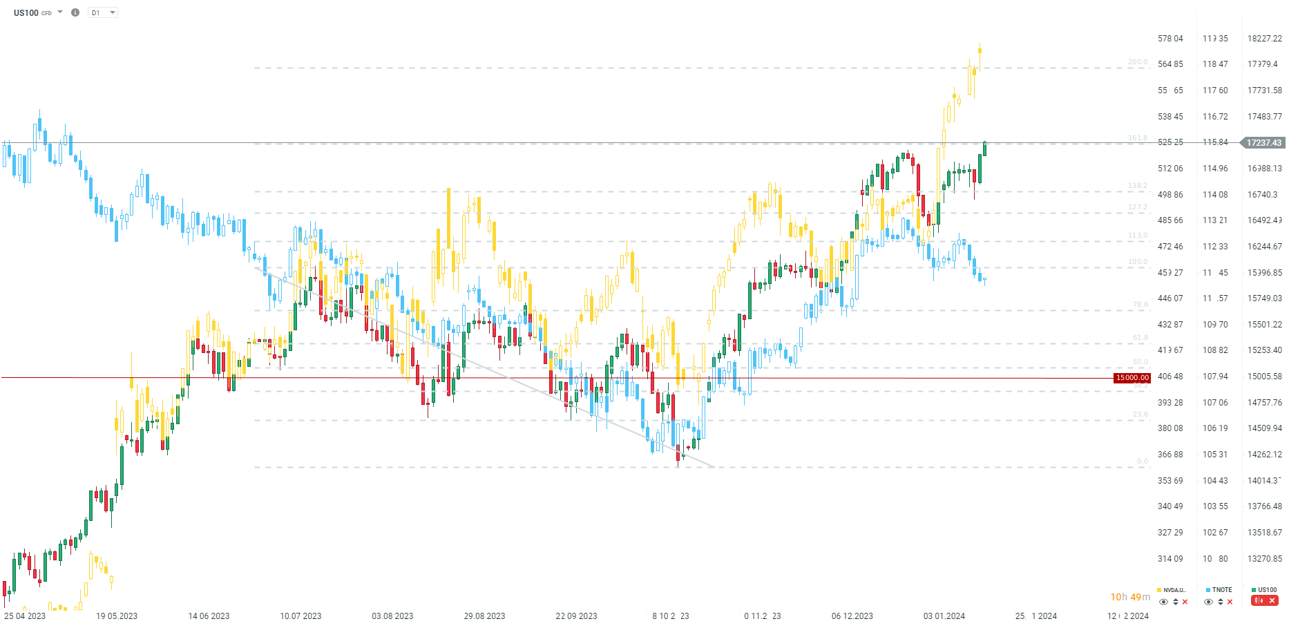 US100 wychodzi na nowe szczyty, motywowany m.in. dalszymi wzrostami Nvidia. Z drugiej strony obserwujemy wyraźny spadek cen obligacji, co oznacza wzrost rentowności i nie jest zbyt dobrą oznaką dla rynku akcji. Źródło: xStation5
