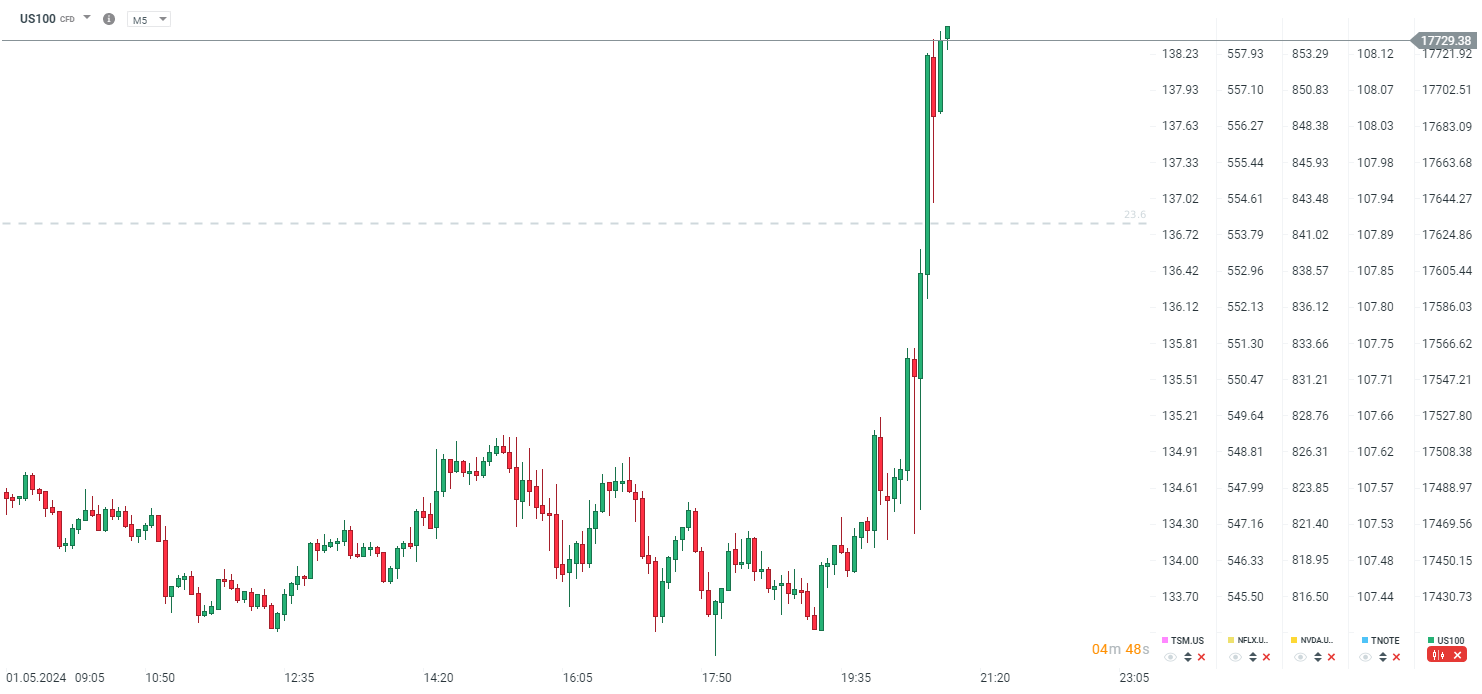US100 w momencie publikacji decyzji skoczył w okolice 17500 punktów, ale dosyć szybko powrócił do poziomów sprzed decyzji, pozostając pod presją, po wczorajszych mocnych spadkach. Warto wspomnieć, że tracą mocno spółki powiązane z sektorem chipów, czyli SMCI (-14%) oraz AMD (-7%), które opublikowały wczoraj wyniki.