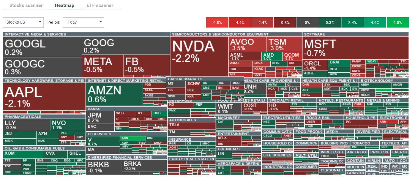 - Widzimy większą aktywność wyprzedaży wśród spółek z sektora AI (zwłaszcza akcji producentów półprzewodników) z Nvidią (NVDA.US) wymazującą wczesne prawie 3% zyski; obecnie akcje największej firmy na świecie tracą ponad 2%.