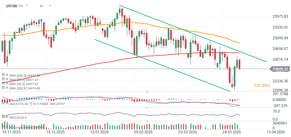 Kontrakt na Nasdaq100 (US100) spada prawie 1,4% przez prawdopodobną eskalację konfliktu na Bliskim Wschodzie, którą zapowiedział wczoraj Donald Trump. Wcześniej rynek wiedziony komentarzami przedstawicieli Białego Domu 'łudził się', że USA wycofają się z konfliktu i być może Teheran zawrze ze Stanami Zjednoczonymi porozumienie.