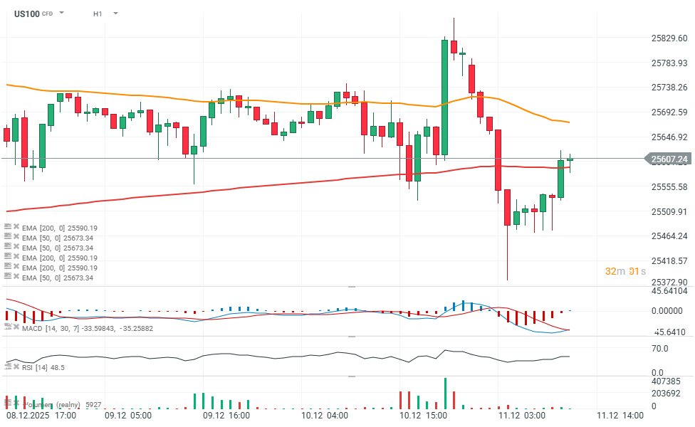 - Kontrakty futures na Nasdaq 100 (US100) spadały w szczycie nawet o ponad 1,5%, co pociągnęło w dół azjatyckie spółki technologiczne. Aktualnie US100 traci blisko 0,8%, a US500 cofa się o 0,6%. W Azji akcje powiązanego z OpenAI SoftBanku spadły w Tokio o ponad 8%.