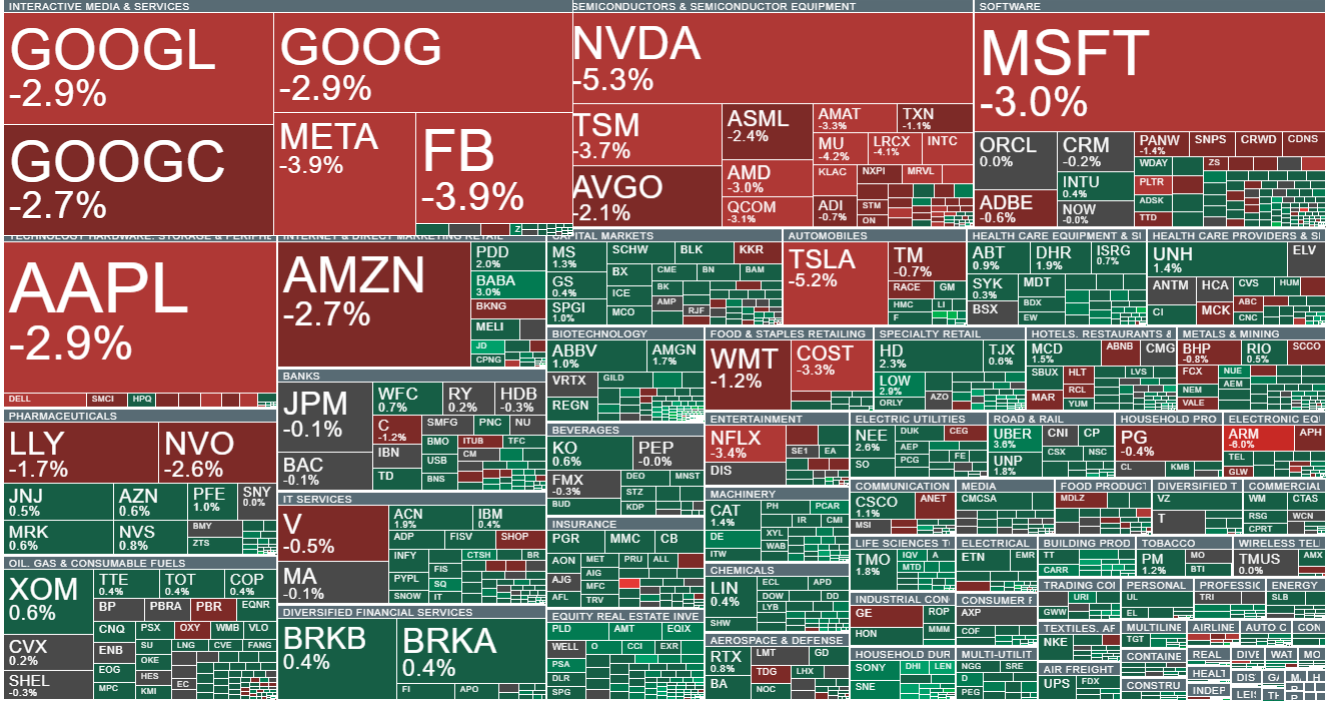 Patrząc na sentymenty wokół amerykańskich akcji, widzimy wyraźnie, że największa sprzedaż dotyczy dziś spółek z sektora technologicznego. Nvidia traci 3,7%; mocne cofnięcie notują też akcje BigTech: Apple, Alphabet, Microsoft i Meta tracą prawie 3%. Źródło: xStation5
