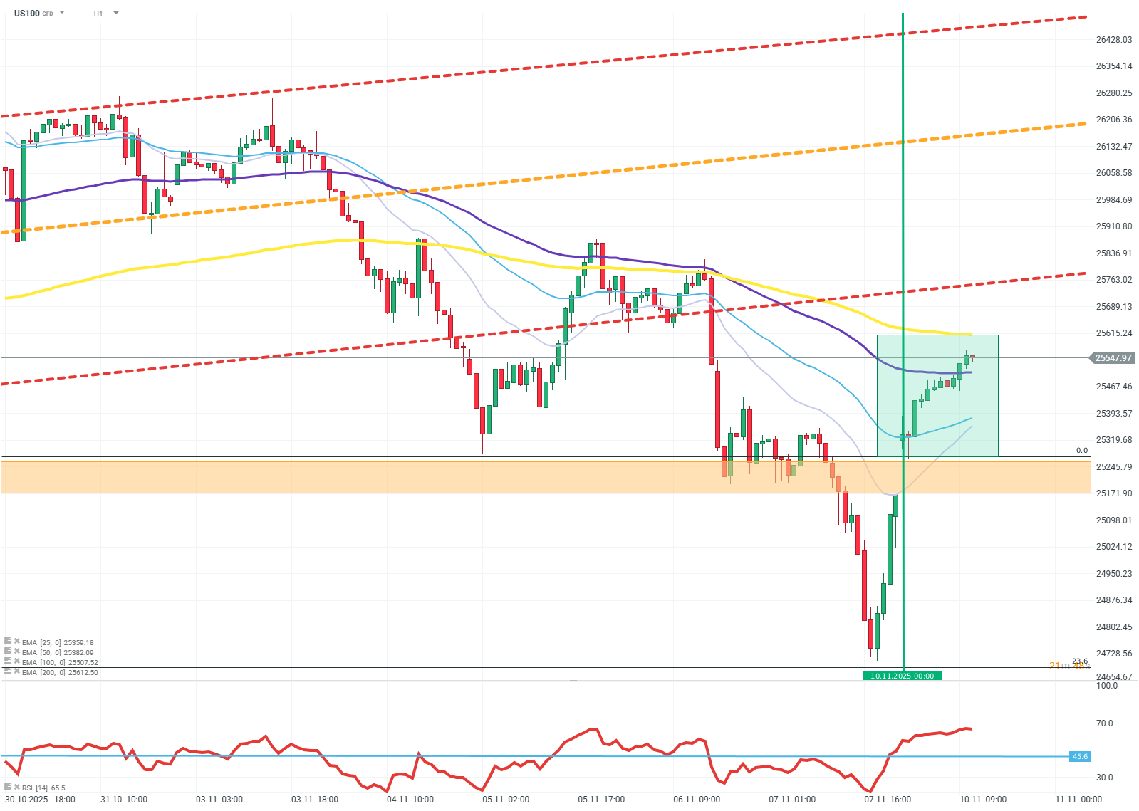 Kontrakty terminowe US100 rosną dziś o ok. 1,5% przed otwarciem giełdy w Stanach, odrabiając część ostatnich spadków w otoczeniu poprawy nastrojów wokół trwającego „zamknięcia rządu” w USA.