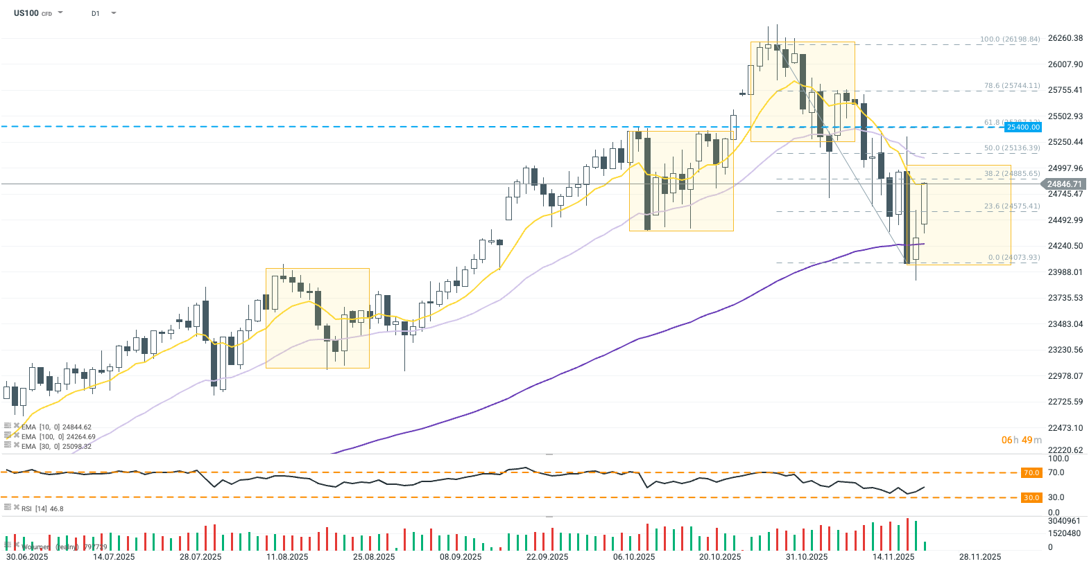 Kontrakt US100 kontynuuje wzrosty pomimo już byczego otwarcia na początku nowego tygodnia. Indeks zdążył pokonać już poziom 23,6 zniesienia Fibonacciego, aktualnie testując 10-dniową EMA (żółty), która pokrywa się mniej więcej z poziomem 38.2 zniesienia Fibo oraz górną granicą geometrii. Wymazanie czwartkowej wyprzedaży powinno otworzyć drogę do szerszego odbicia na Wall Street, na które pozwala również neutralne RSI. Z kolei odbicie się od EMA10 będzie wskazywało na większą ostrożność inwestorów, zwłaszcza w kontekście decyzji Fed. Źródło: xStation5