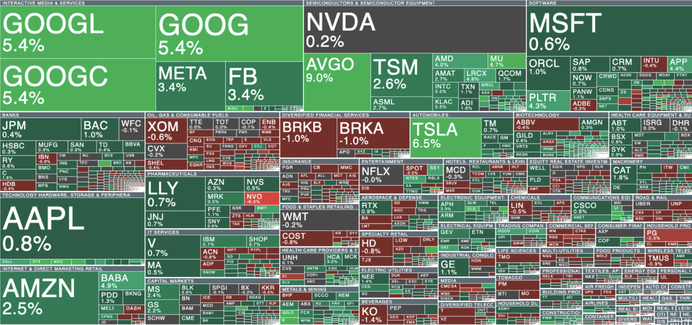 Wall Street wyciągają przede wszystkim notowania Big Techów, w tym spółek Magnificent 7 (Alphabet: +5,4%, Amazon: +2,5%, Tesla: +6,5%, Meta: +3,4%). Na zielono świeci się również niemal cały sektor półprzewodników (m.in. Broadcom: +9%, AMD: +4%, Micron: +6,7%). Co ciekawe, euforia na spółkach technologicznych nie obciąża dzisiaj notowań bardziej defensywnych farmaceutyków czy spółek związanych z ochroną zdrowia (m.in. Pfizer: +1,1%, Merch: +3,5%). Źródło: xStation5
