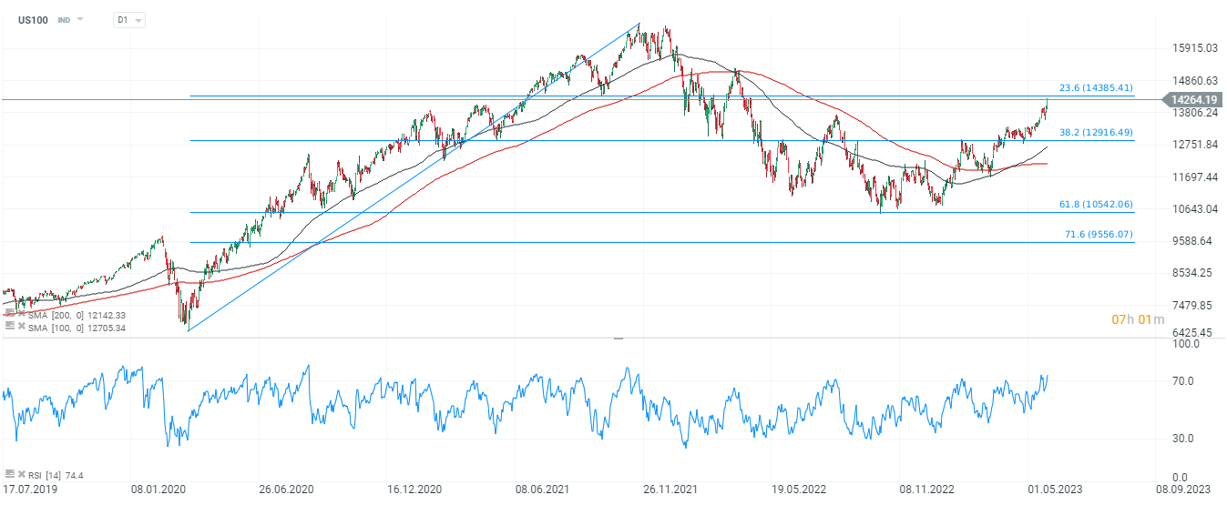 W efekcie główne indeksy z Wall Street wzrosły po otwarciu, napędzane optymizmem związanym z potencjalnym porozumieniem w sprawie pułapu zadłużenia. Jeśli porozumienie zostanie osiągnięte, może to doprowadzić do dalszych wzrostów na rynku i potencjalnie doprowadzić do przełamania kluczowego poziomu oporu dla Nasdaq, który może przebiegać w okolicy 23,6 zniesienia fali wzrostowej z marca 2020 roku, w okolicach 14,400 pkt. Wciąż świetnie radzą sobie spółki z branży AI. Choć euforia na walorach Nvidia (NVDA.US) delikatnie opadła świetnie radzi sobie m.in. Arista Networks (ANET.US), AMD (AMD.US) czy C3.ai (AI.US).