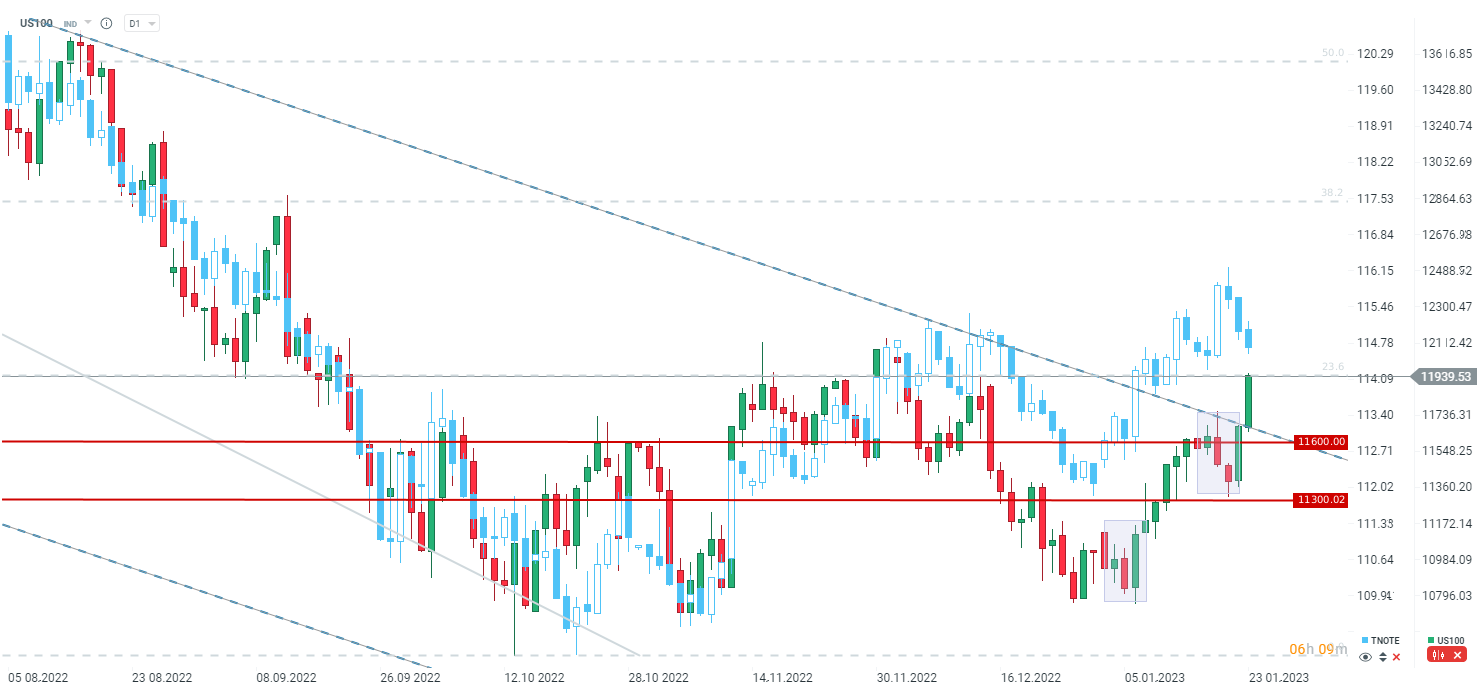 Ostatni pełny tydzień stycznia zaczyna się fenomenalnie na Wall Street. US100 zyskuje ponad 2,2%, choć dzisiaj nie poznaliśmy żadnych ważniejszych odczytów makroekonomicznych z USA oraz żadnych ważniejszych raportów finansowych ze spółek z Wall Street. Niemniej rynek liczy na to, że Fed zakomunikuje pewną zmianę w polityce monetarnej, a przynajmniej kolejny raz zmniejszy skalę podwyżek do 25 punktów bazowych. W zeszłym tygodniu mogliśmy usłyszeć wielokrotnie ze strony amerykańskich bankierów, że powinniśmy szykować się na 25 punktów bazowych podwyżki.