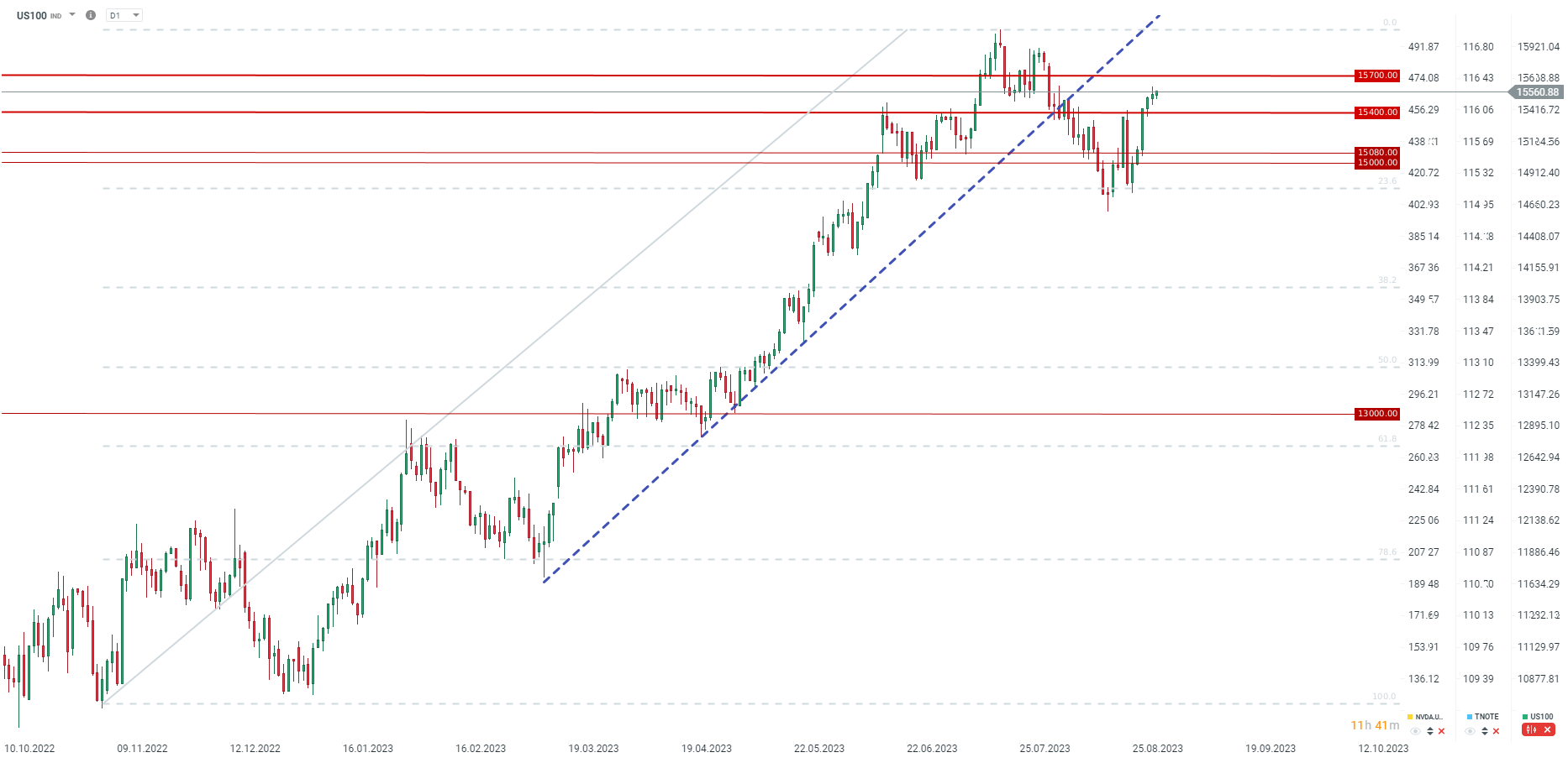 US100 po niemrawej wczorajszej sesji kontynuuje trend wzrostowy, testując okolice 15555 punktów. Słaby raport NFP może doprowadzić do przetestowania okolic 15700 punktów. Jeśli jednak wzrost zatrudnionych będzie solidny, wtedy będzie szansa na test wsparcia przy 15400 punktach. Źródło: xStation5