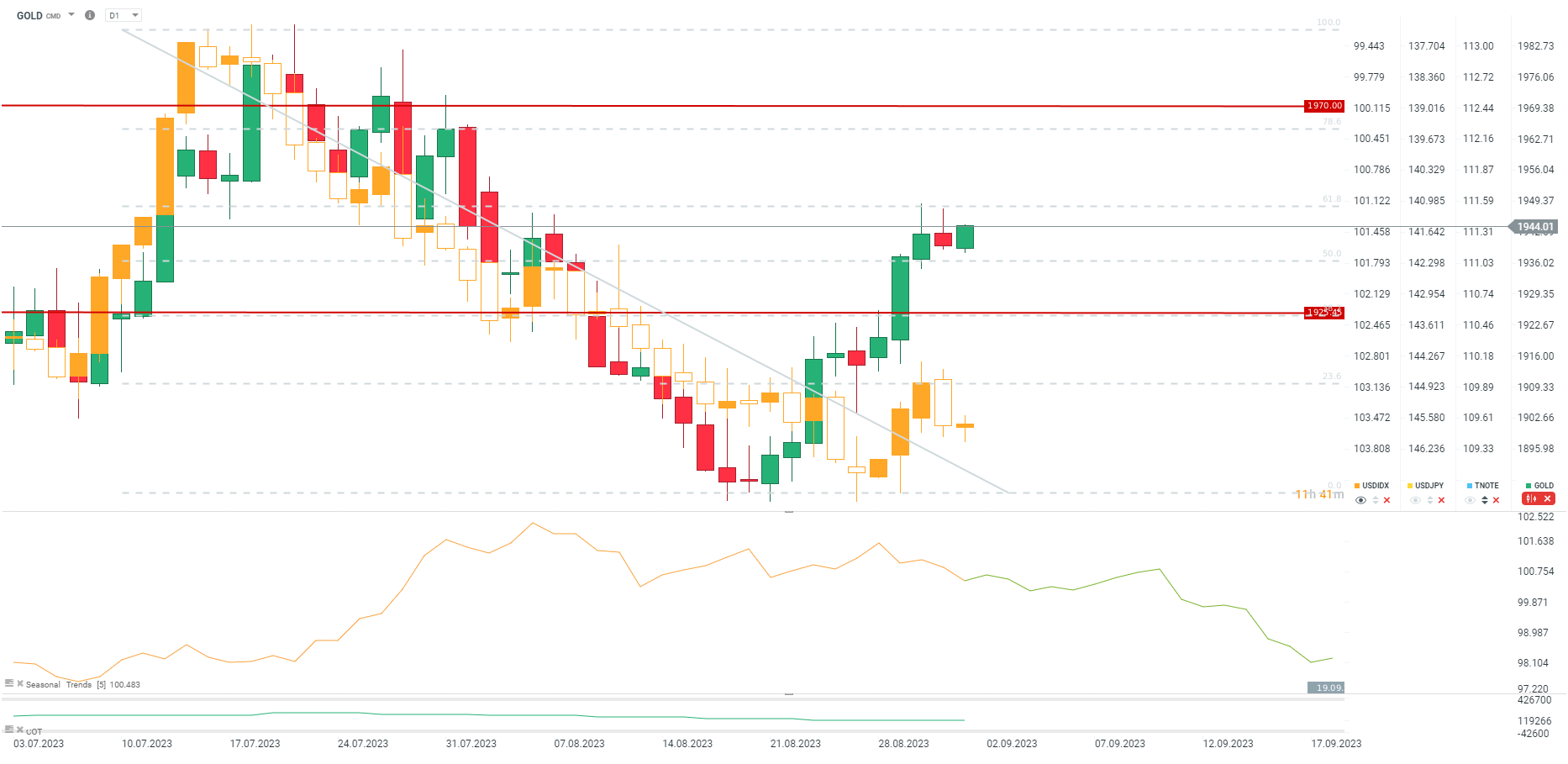Złoto ma problem z wyjściem powyżej 1950 USD za uncję. Słaby raport NFP mógłby na nowo wznowić słabość dolara i spadek rentowności, co pozwoliłoby przetestować opór. Jeśli jednak raport zostanie odczytany pozytywnie, wtedy zejście poniżej zniesienia 50.0 może wywołać głębszą korektę do okolic 1925 USD za uncję. Źródło: xStation5