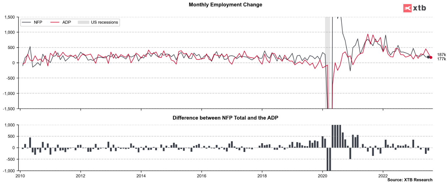 Posiedzenie FOMC zbliża się wielkimi krokami, a biorąc pod uwagę, że dane opublikowane do tej pory były niejednoznaczne, dane NFP i CPI za sierpień będą uważnie obserwowane przez inwestorów. Ostatnie dane z amerykańskiego rynku pracy, takie jak raport JOLTS o wakatach czy raport Challengera za sierpień, wskazywały na schłodzenie sytuacji na amerykańskim rynku pracy. Co więcej, prywatny raport ADP opublikowany w środę zasugerował wzrost liczby miejsc pracy o zaledwie 177 tys. wobec oczekiwanego wzrostu o 195 tys. Był to najgorszy raport ADP od 2020 roku.