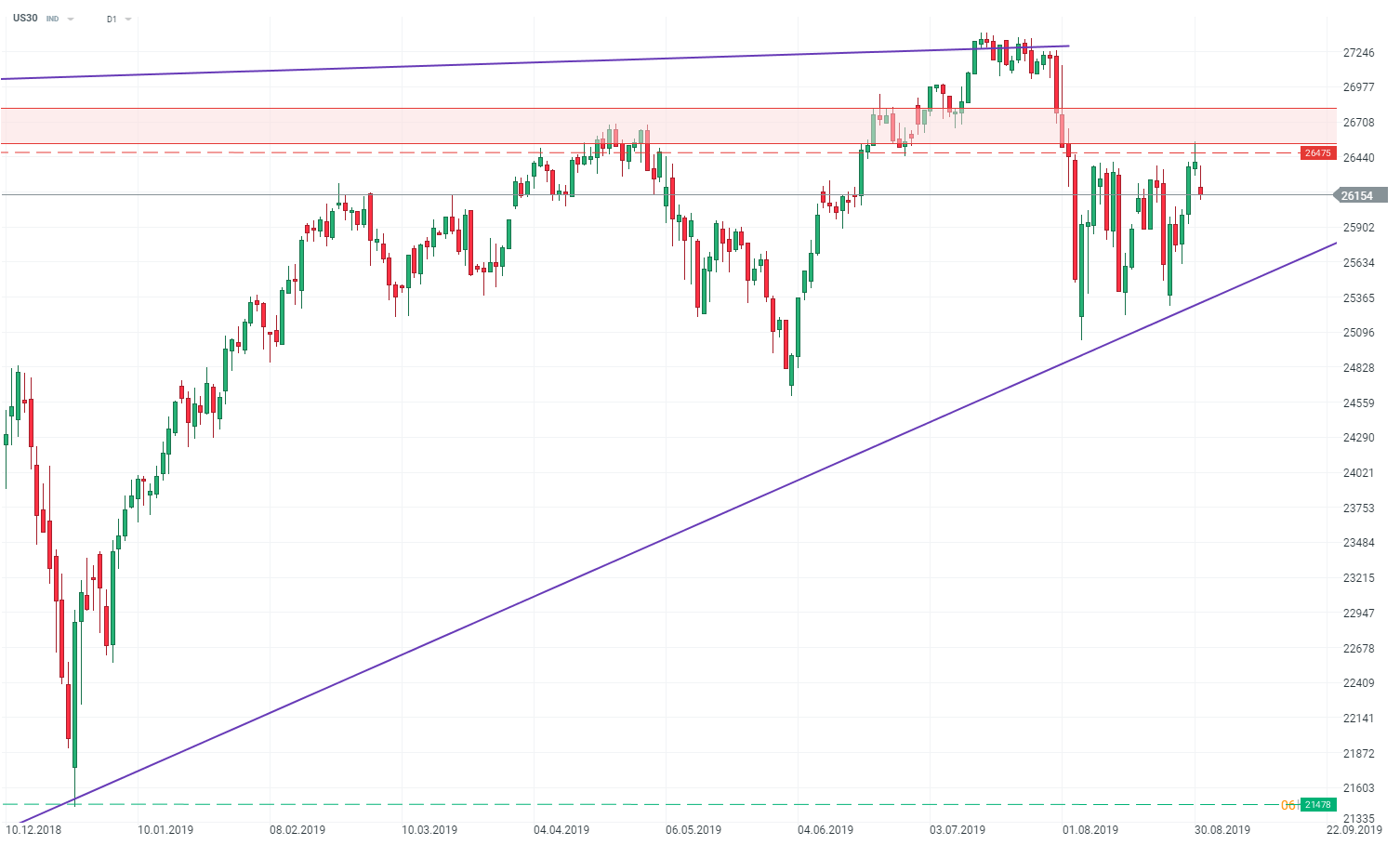 US30, kontrakty terminowe oparte o notowania amerykańskiego indeksu Dow Jones, odnotowały gwałtowny spadek na kilka minut przed godziną 18:00. Powodem były doniesienia mówiące o tym, że Stany Zjednoczone i Chin mają problemy z dogadaniem szczegółów spotkań negocjatorów, które miały odbyć się we wrześniu. Podobno Chiny poprosiły stronę amerykańską o odroczenie najnowszej rundy ceł. Niemniej USA odmówiło i oba kraje wprowadziły zapowiadane cła. Tego typu informacje z pewnością nie wspierają nastrojów rynkowych i pokazują, że tak naprawdę wciąż jesteśmy bardzo daleko od jakiegokolwiek porozumienia. Indeks US30 wymazał cały dzisiejszy wzrost i notowany jest w okolicach poziomu 2900 pkt. Ze względu na obchodzone dziś Święto Pracy w USA, reakcję rynku kasowego poznamy dopiero jutro po południu.
