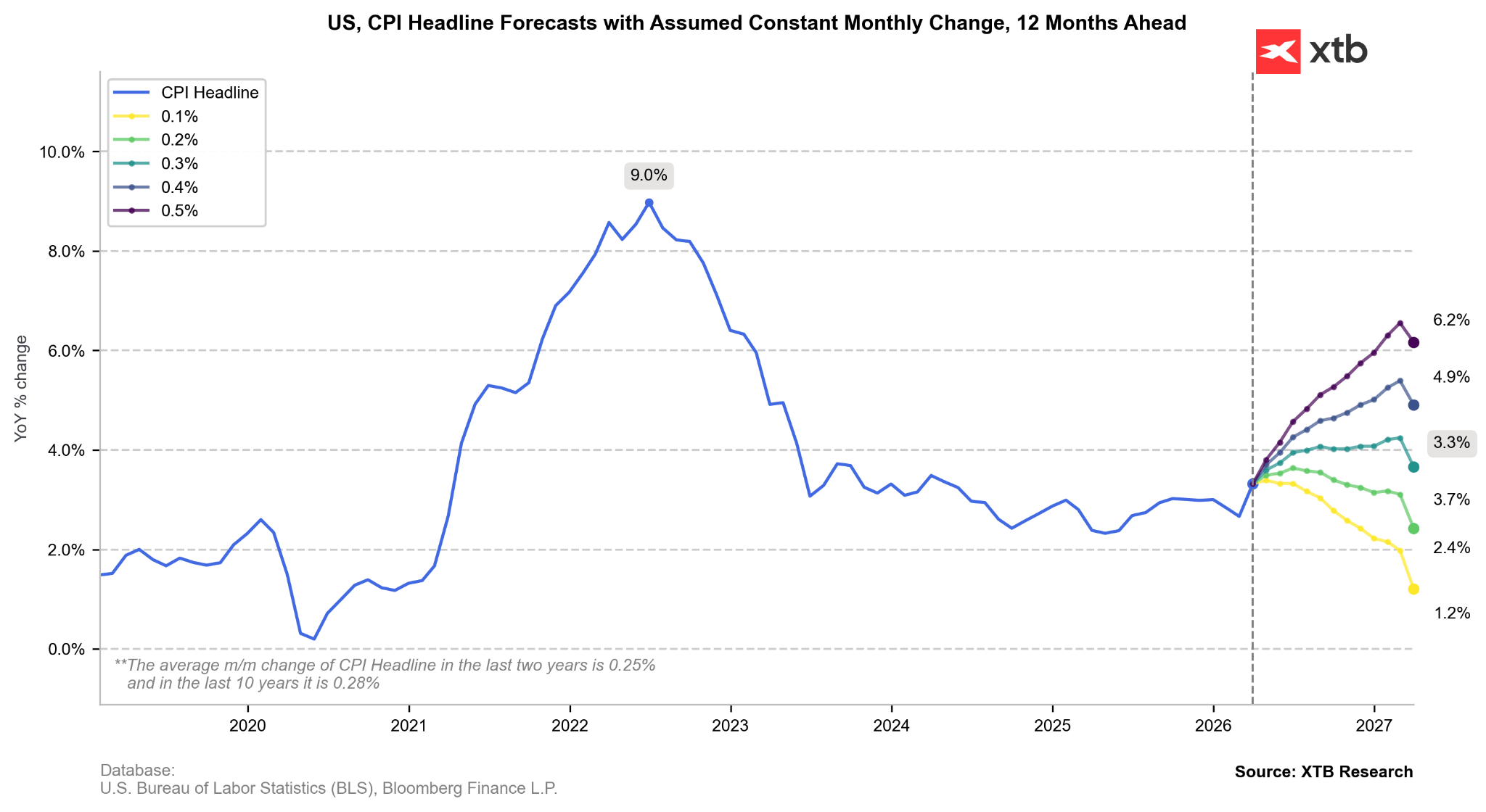 Jeśli inflacja rosłaby teraz średnio o 0,3%, to przebijemy niedługo poziom 4,0%, ale inflacja ulegnie stabilizacji. Z drugiej strony wzrost o zaledwie 0,2% miesięcznie będzie oznaczał, że inflacja za moment powróci ponownie do spadku w ujęciu rocznym. Taki scenariusz jest możliwy przy spadku cen ropy. Źródło: Bloomberg Finance LP, XTB