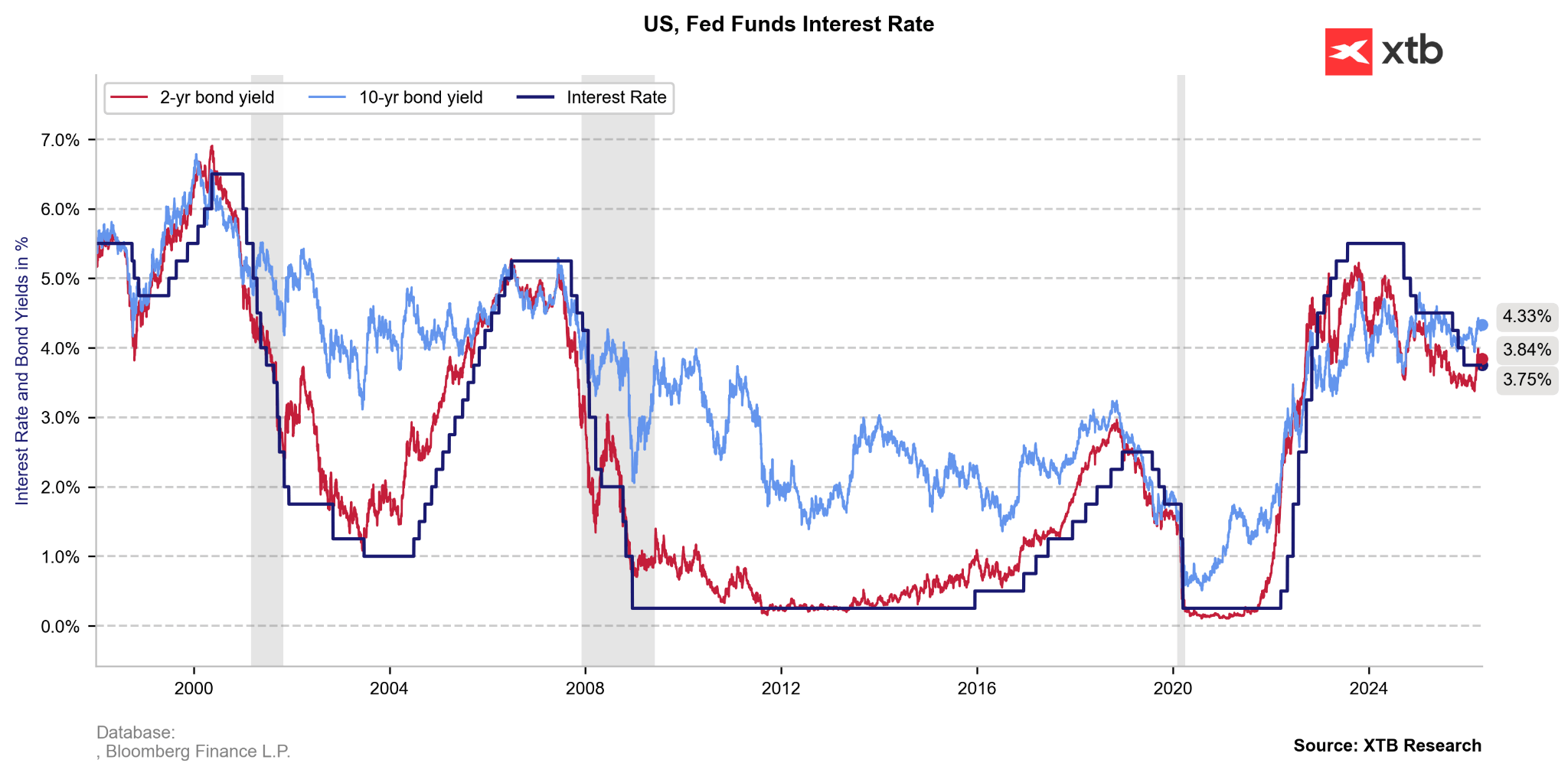 Rentowności obligacji pozostają podwyższone wobec niepewności związanej z sytuacją na Bliskim Wschodzie. Warto jednak zauważyć, że premia rentowności nad stopami procentowymi w przeszłości była czymś normalnym. Stopy procentowe obecnie po prostu nie są nadmiernie wysokie, jak miało to miejsce na przełomie 2023/2024. Źródło: Bloomberg FInance LP, XTB