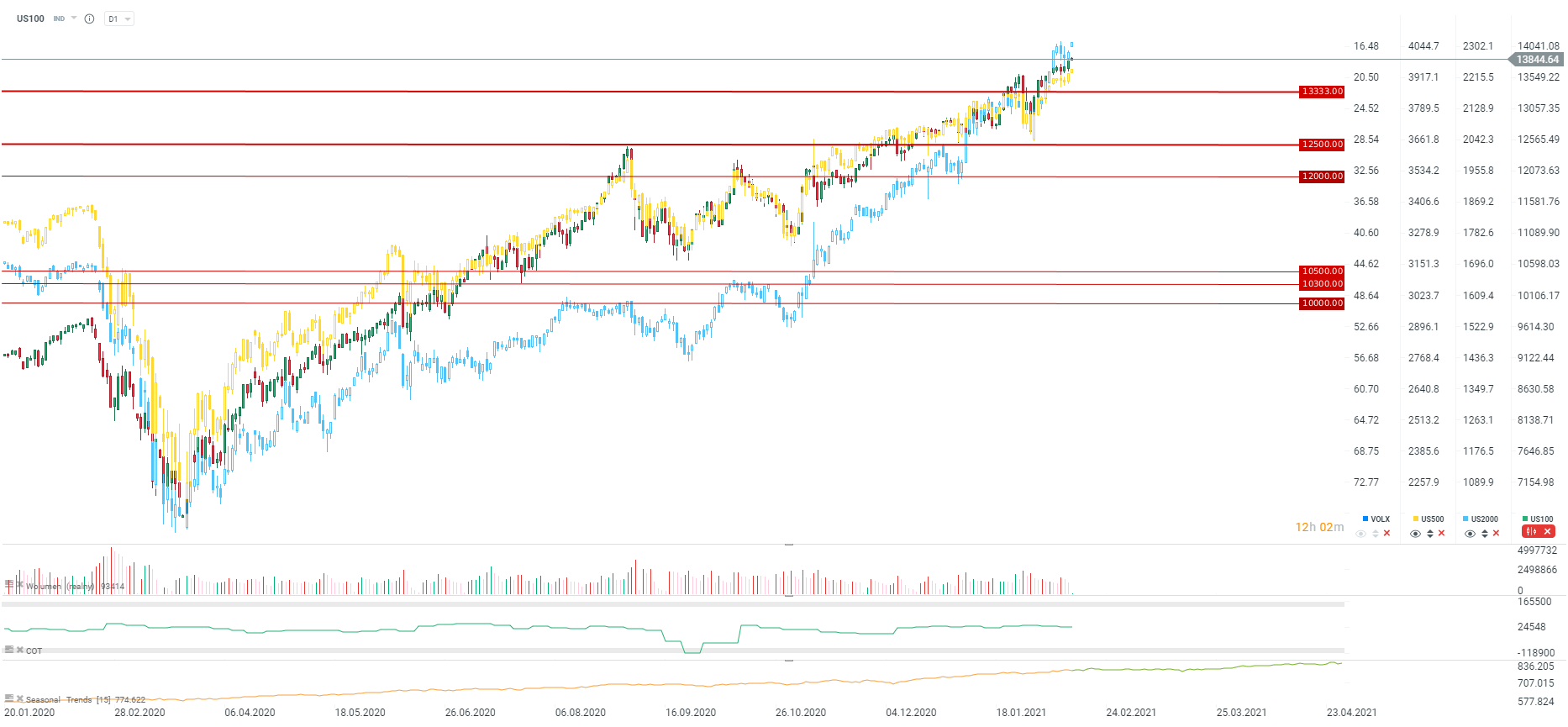 Główne kontrakty z Wall Street – US100 (zielono czerwony), US500 (żółty), US2000 (niebieski) na nowych historycznych szczytach w Dzień Prezydenta w USA. Źródło: xStation5