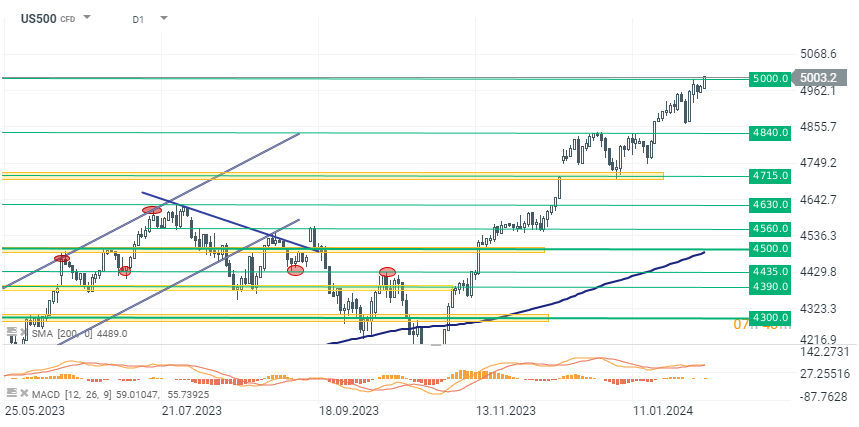 Środowa sesja na Wall Street stoi pod znakiem wzrostów. US500 wybił się powyżej bariery 5000 punktów i tym samym przebił nowe rekordy wszech czasów. Same zwyżki amerykańskich indeksów mogą być dla niektórych zastanawiające, ponieważ z jednej strony obserwujemy coraz to śmielsze komentarze bankierów FED sygnalizujących, że pierwsze obniżki mogą nie przyjść tak szybko jak się tego spodziewano, a po drugie w sektorze bankowym obserwujemy dzisiaj spadki wynikające z obaw związanych z ryzykiem płynnościowym New York Community Bancorp (NYCB.US). Walory Tesli (TSLA.US) zyskiwały dzisiaj nawet 3% po doniesieniach o tym, że amerykańscy menedżerowie spółki zostali zobowiązani do oceny, czy rola każdego z członków ich zespołu jest krytyczna. Wzrosty te zostały już jednak całkowicie wymazane.