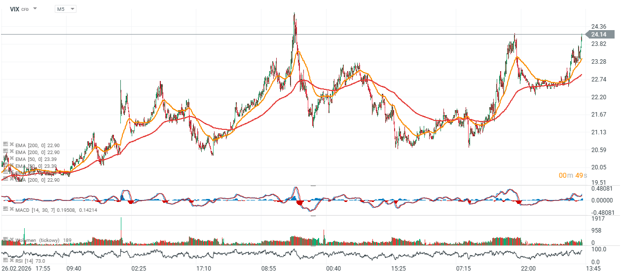 Indeks VIX osiąga lokalne maksima po tym jak w godzinach nocnych cofnął się na chwilę poniżej poziomu 23. Popyt na hedging przed dalszymi spadkami pozostaje mocny, a rynek analizuje, czy obecne poziomy wycen będą możliwe do utrzymania w scenariuszu wzrostu rentowności i impulsu inflacyjnego.