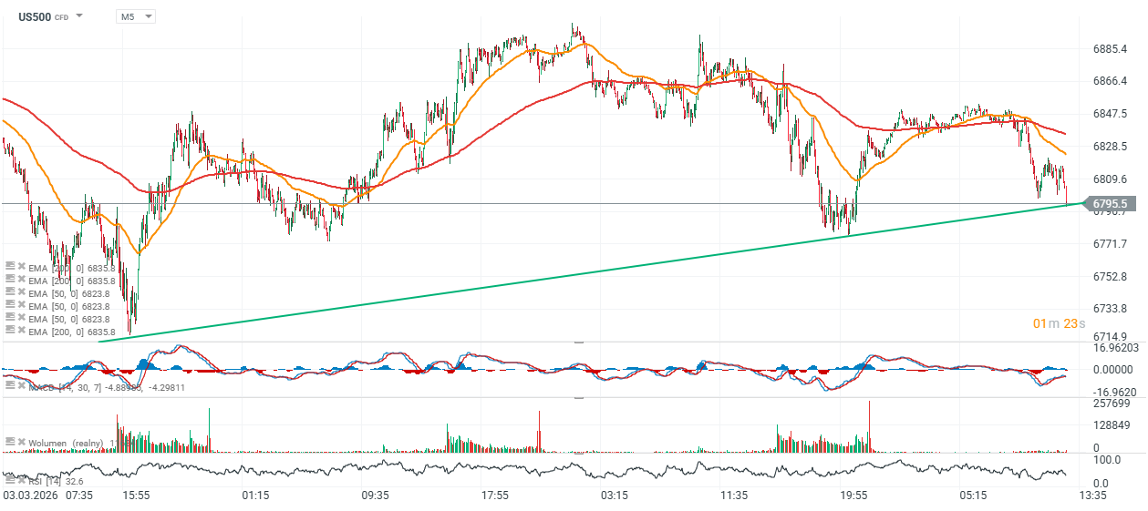 - Wydaje sie, że w krókim terminie US500 możę respektować dolne ograniczenie linii trendu, natomiast tąpnięcie poniżej 6800 punktów może wywołać presję na retest lokalnych minimów przy 6720 punktów. Wskaźnik RSI na krótkoterminowym, 5-minutowym interwale spadł ponownie w pobliże 30, sygnalizując wyprzedanie.