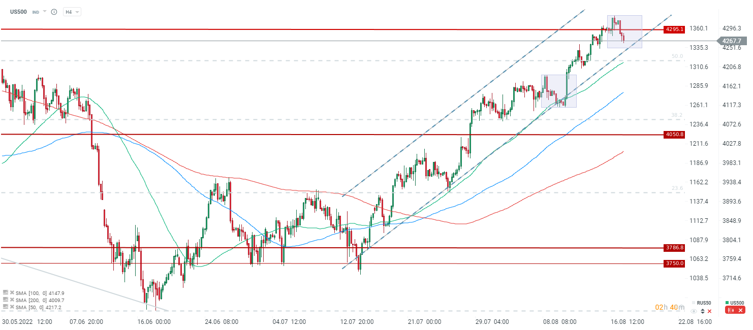 US500 (S&P 500 fut) traci ok. 1% przed ważnym wydarzeniem dzisiejszego wieczora. O 20:00 opublikowane zostaną minutes z lipcowego posiedzenia, na którym Fed zdecydował się na kolejną podwyżkę o 75 punktów bazowych. Od tamtego czasu rynek nastawiony jest na tzw. „Fed pivot”, czyli zmianę kierunku ze strony polityki monetarnej w USA. Niektórzy obserwatorzy rynku uważają, że nadszedł już czas, aby Fed zmniejszył tempo podwyżek stóp procentowych, wobec idącego spowolnienia oraz wyznaczenia szczytu inflacji.