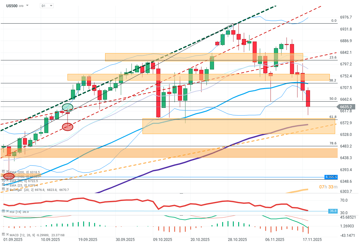 Obawy co do wpływu zamknięcia rządu na kondycje gospodarki, słabszy sentyment konsumentów i słabnący rynek pracy. Jednym wyraźnych wskazań takiej słabości są choćby ostatnie wyniki Home Depo (HD.US), spółka wyraźnie ostrzega przed pogorszeniem się koniunktury. W tych okolicznościach FOMC w ostatnich tygodniach zaczęło sygnalizować, że obniżka stóp w grudniu — nie jest tak pewna jak wydawało się to rynkowi jeszcze do niedawna. Szanse na cięcie stóp w grudniu spadły z ok. 40% w ubiegłym do 20% w tym tygodniu. Wyceny akcji zareagowały na taki scenariusz ‘alergicznie’.