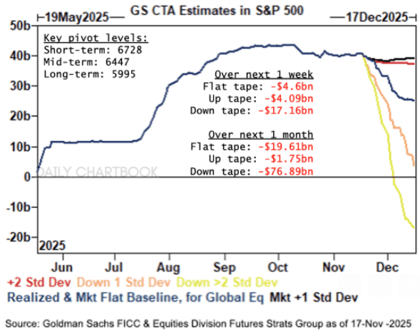 Po tym jak indeks S&P 500 spadł poniżej 6728 punktów, do grona sprzedających dołączyły fundusze CTA. Z uwagi na specyfikę swojej działalności i strategii, dopóki indeks utrzymywał się powyżej 50-dniowej EMA, nie dokładały cegiełki do spadków. Teraz jednak tzw. ‘strategie systemowe’ komplikują Wall Street szanse na nagłe odwrócenie nastrojów i odbicie, w miarę jak CTA muszą sprzedawać ‘razem z rynkiem’.