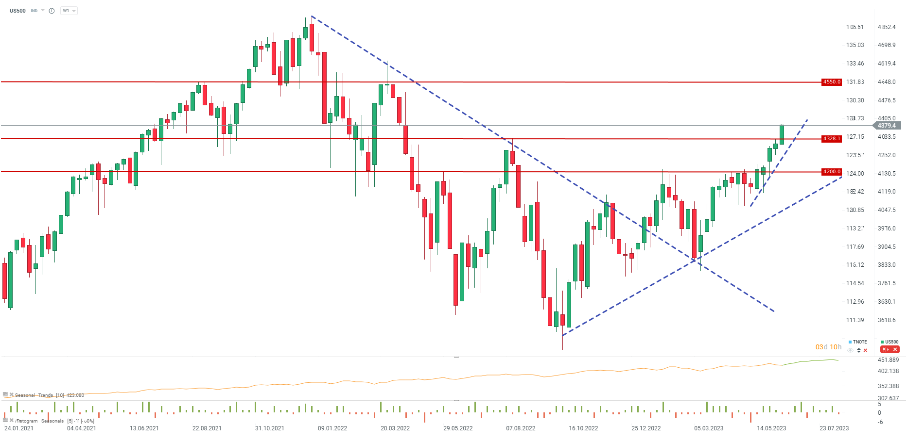 Kontrakt na indeks znajduje się najwyżej od kwietnia zeszłego roku. Od początku tego roku US500 zyskał już ok. 13%, a od lokalnego dołka z października 2022 roku ponad 20%, wyrywając się z rynku bessy. Jeśli wydźwięk dzisiejszej decyzji będzie jastrzębi, istnieje szansa na realizację zysków po ostatnim rajdzie. W takim wypadku US500 straci prawdopodobnie ponad 1% od szczytów, a najbliższe silne wsparcie znajduje się w okolicach 4330 punktów. Jednocześnie krótkoterminowa linia trendu wzrostowego powinna być utrzymana. Zasięg 10% ruchu od majowej decyzji o ostatniej podwyżce znajduje się w okolicach 4550 punktów, przy lokalnych szczytach z marca 2022 roku.