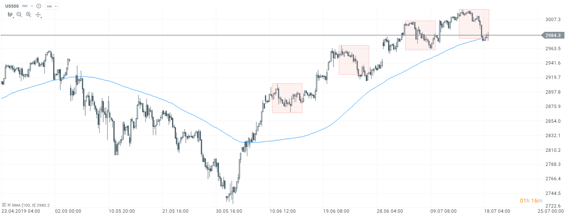 US500 wraca powyżej górnego ograniczenia układu Overbalance, po przetestowaniu średniej SMA100. Źródło: xStation5