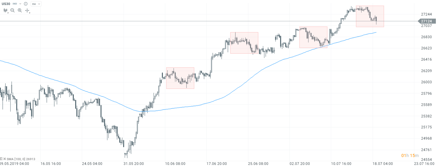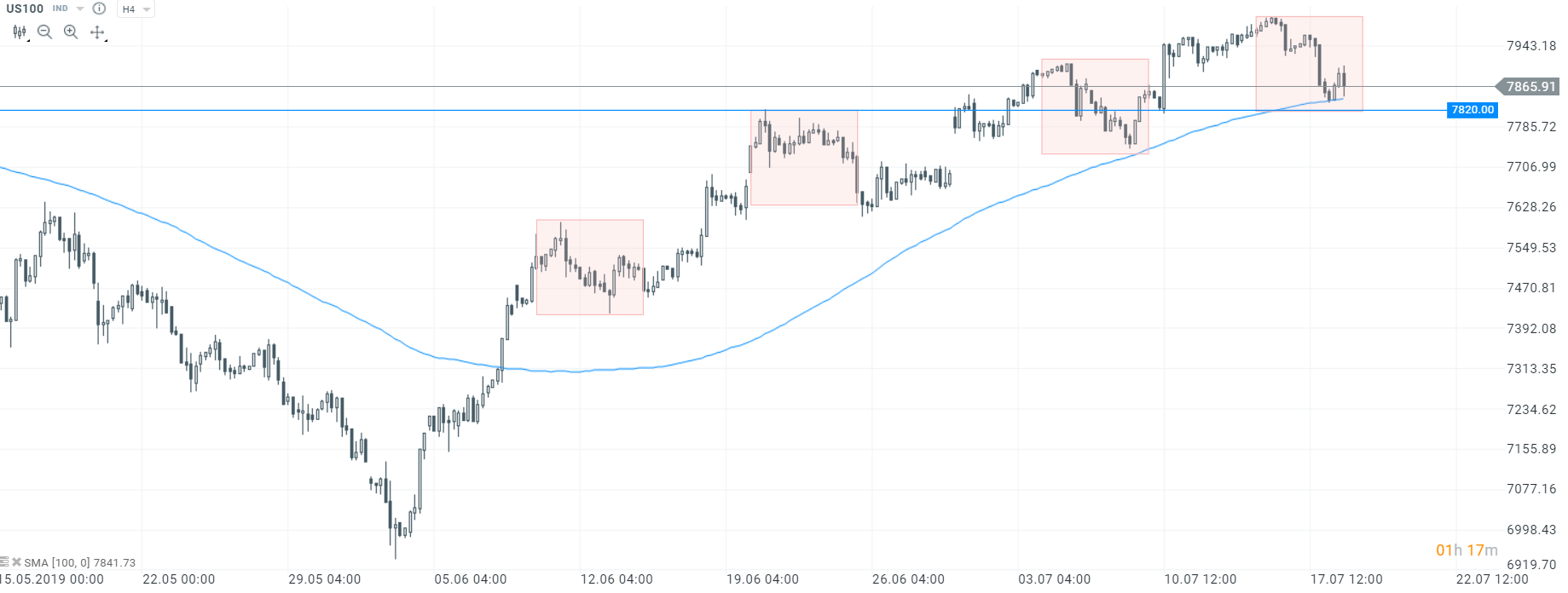 US100 broni prostej średniej kroczącej z ostatnich 100 okresów. Dolne ograniczenie układu Overbalance znajduje się nieco niżej. Źródło: xStation5