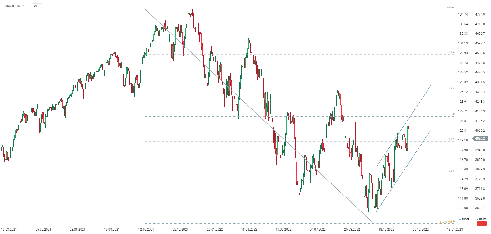 US500 bardzo mocno traci po publikacji raportu NFP. Strata wynosi obecnie ok. 1,5%, natomiast US100 traci ponad 2%. Umacnia się również amerykański dolar. Dane są naprawdę mocne, przyrost zatrudnienia rzędu 263 tys. oraz potężny wzrost płac na poziomie 5,1% r/r. To wszystko powoduje, że Fed nie ma aż tak dużo argumentów za spowolnieniem podwyżek. Uważamy jednak, że Fed może spowolnić podwyżki do 50 pb w grudniu, choć oczywiście będzie to zależało od odczytu inflacyjnego 13 grudnia - na dzień przed decyzją.
