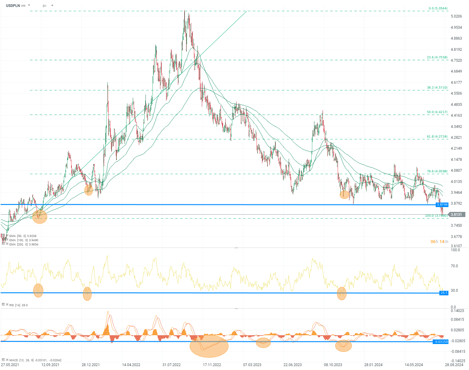 Złoty umocnił się w miesiąc o ponad 3,5%, a tylko dzisiaj wzrósł 1% względem dolara amerykańskiego i znajduje się obecnie na najniższym od trzech lat poziomie. W tym momencie jedynym oporem w ruchu wzrostowym pozostaje dołek z września 2021 na poziomie 3,7890. W razie krótkoterminowej reakcji na walucie pierwszym wsparciem będzie 3,8744 złoty za dolara, którego przekroczenie pozwoli na powrót do 50 EMA o wartości 3,9238. RSI znajduje się blisko trzy letnich poziomów wyprzedania. Jedynie trzy razy oscylator wskazywał wartość 25,7 lub niższą i stanowiło dotychczas sygnał do krótkoterminowego odreagowania. Równocześnie MACD dwa z trzech razy potwierdziło sygnał odreagowania przekraczając obecny poziom. Warto więc obserwować czy MACD przebije obecne poziomy, co mogłoby potwierdzić dywergencję. Źródło: xStation