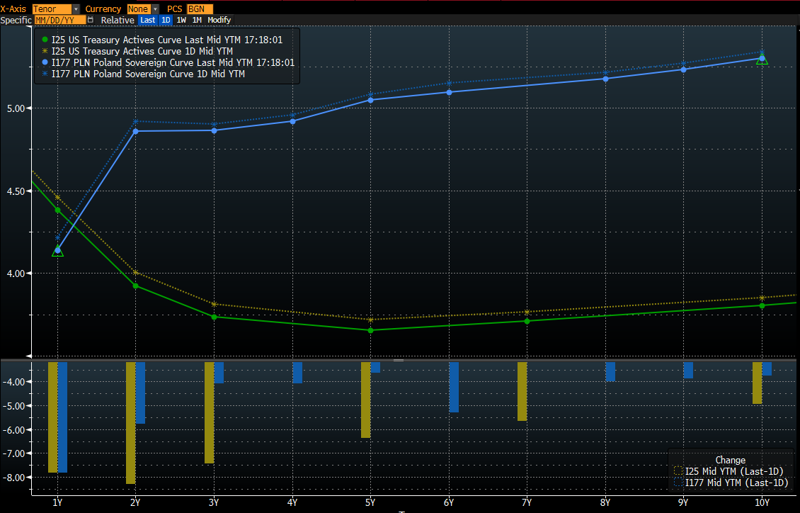 Rynek wycenia obecnie ok. 33% szansy na 50 pb cięcia we wrześniu i w pełni wycenia 100 pb w 2024 roku. Amerykańska krzywa rentowności spadła dużo głębiej niż polska. Jest to jeden z powodów dalszej aprecjacji krajowej waluty. Widoczne jest jeszcze większe wystromienie się krajowej krzywej, gdzie najmocniejszy spadek widoczny był na rentownościach krótkoterminowych obligacji. Amerykańska krzywa zareagowała podobnie na krótszym końcu, warto jednak zauważyć dużo większy spadek na 5 i 7 letnich obligacjach amerykańskich. Inwestorzy spodziewają się więc dosyć szybkich obniżek.
