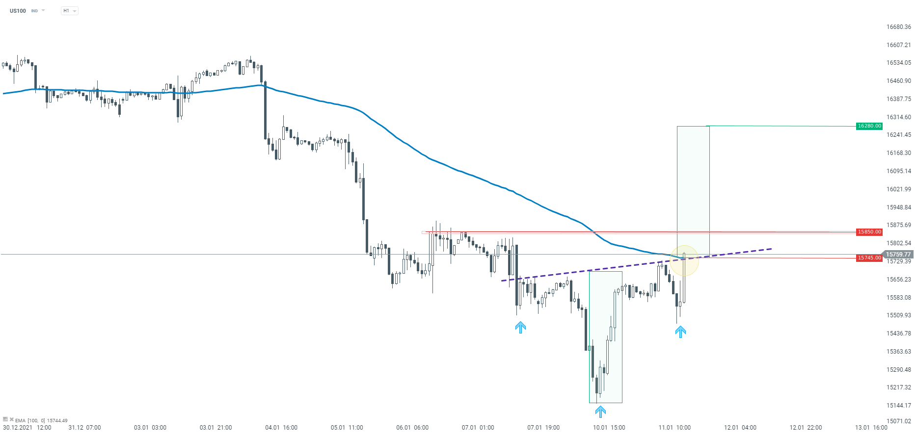 Patrząc na wykres US100, na interwale H1 możemy zauważyć potencjalną formację odwróconej głowy z ramionami, która zazwyczaj zapowiada wzrosty. Aktualnie obserwujemy atak na lnie szyi, która grupuje się także ze średnią z ostatnich 100 okresów. W przypadku wybicia w górę, modelowy zasięg dla formacji oRGR znajduje się przy 16280 pkt. Źródło: xStation5