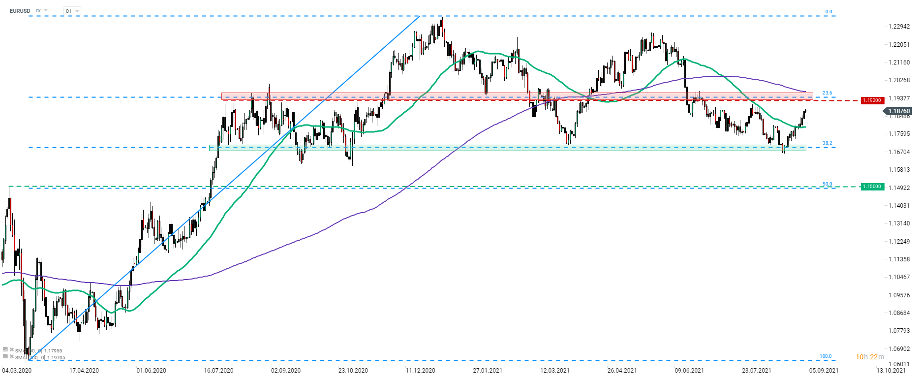 EURUSD kontynuuje wspinaczkę na wyższe poziomy za sprawą słabości dolara. Para powoli zbliża się do strefy oporu przy 1,1930, wyznaczonej przez poprzednie reakcje cenowe oraz mierzenie 23,6% Fibo impulsu wzrostowego zapoczątkowanego w marcu 2020 roku. Źródło: xStation5