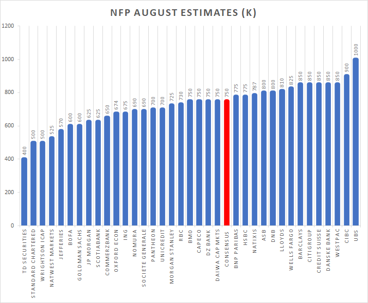 Sierpniowa prognoza NFP w zestawieniu od Newsquawk. Jak widać zakres szacunków (400-1000k) jest szeroki. Co ciekawe, żadna z instytucji uwzględnionych w zestawieniu nie spodziewa się tak słabego odczytu, jak pokazały to dane ADP (374 tys.). Źródło: Newsquawk Twitter